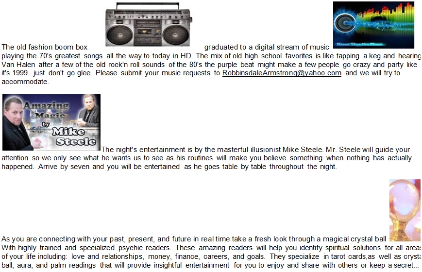Arriving between six and seven o'clock in the evening will make checking in much easier for our reunion staff and allow you time to relax before the traditional alumni rush of people arriving fashionably late. If you want to take in the whole experience, consider having dinner inside the Creekside dining room adjacent to lounge as a meal will help with pacing yourself for the long night of fun. The spirits of cheer will be flowing with several specially created Robbinsdale Armstrong mixed drinks in school colors Red, Blue, and White. All food and drink is pay as you go so bring your cash or credit card. An ATM is onsite. If you have a camera or Smartphone; make sure the battery is fully charged just in case you need to use the GPS when it's time to call a taxi to drive you home.